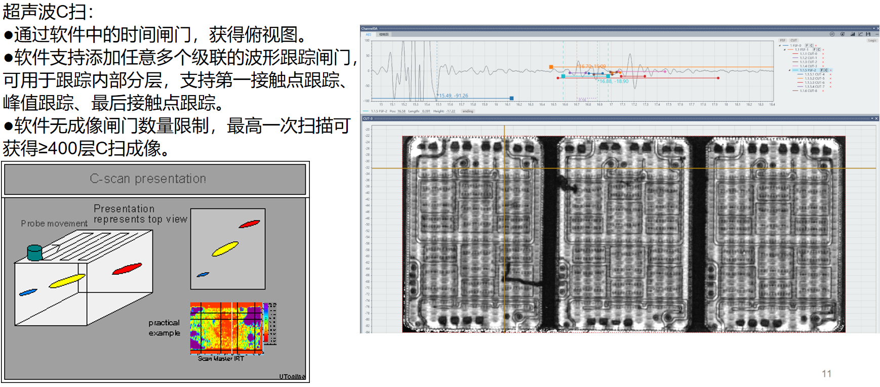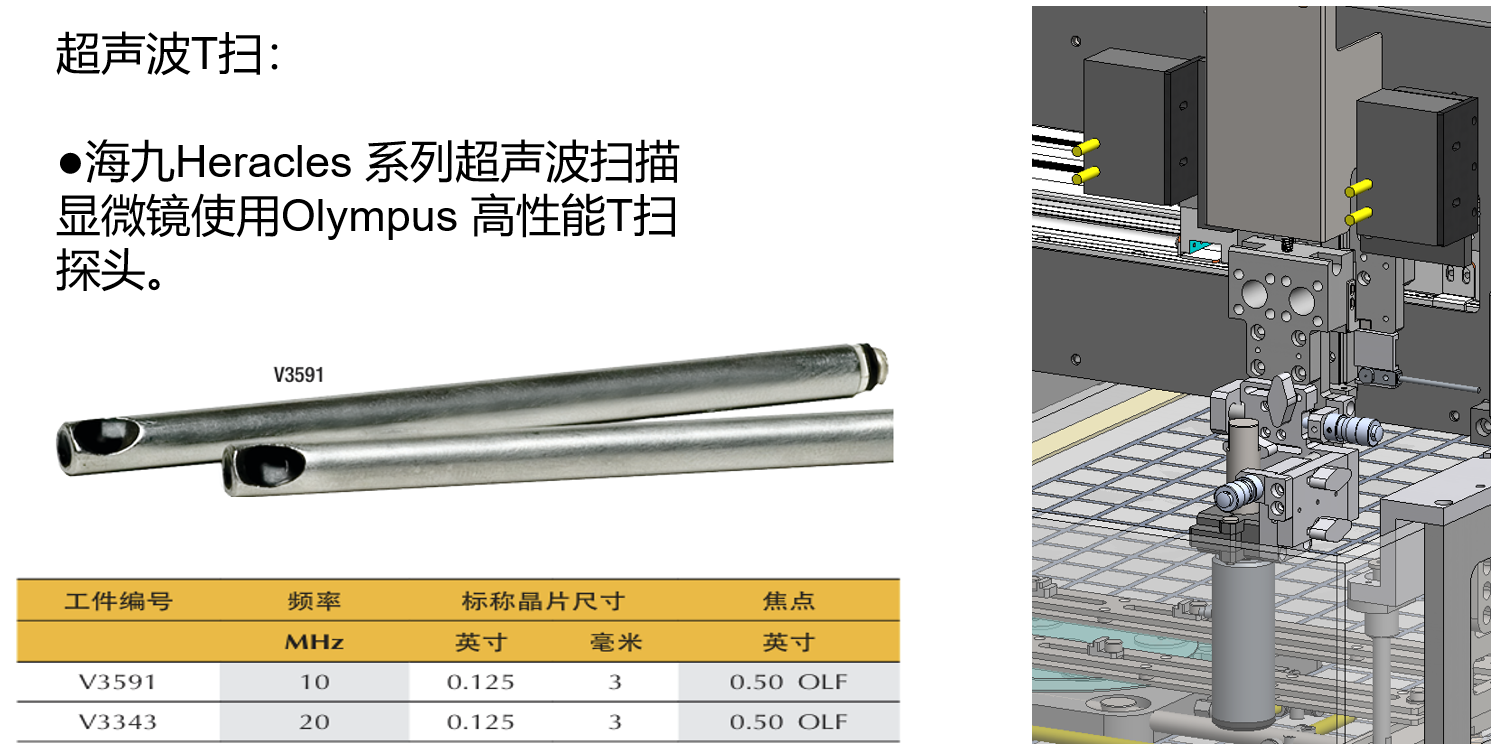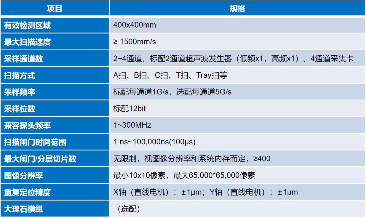 项目HJ 100标准机规格有效检测区域400x400mm最大扫描速度 1500mm/s采样通道数2~4通道扫描方式A扫、B扫、C扫、T扫、Tray扫等采样频率标配每通道1G/s,选配每通道5G/s探头频率1~500MHz扫描闸门时间范围最小1 ns,最大100,000 ns最大分层切片数 400层图像分辨率最小10x10像素,最大65,000*65,000像素最小缺陷精度5um大理石模组(选配)