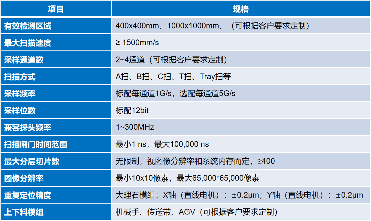 项目HJ Union 100自动机规格有效检测区域400x400mm、1000x1000mm、(可根据客户要求定制)最大扫描速度 1500mm/s采样通道数2~4通道(可根据客户要求定制)扫描方式A扫、B扫、C扫、T扫、Tray扫等采样频率标配每通道1G/s,选配每通道5G/s探头频率1~500MHz扫描闸门时间范围最小1 ns,最大100,000 ns最大分层切片数 400层最小缺陷精度5um上